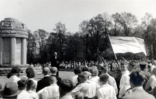 Foto: Gedenkrede am Ehrenmal im Stadtpark durch Pfarrer Schweinitz